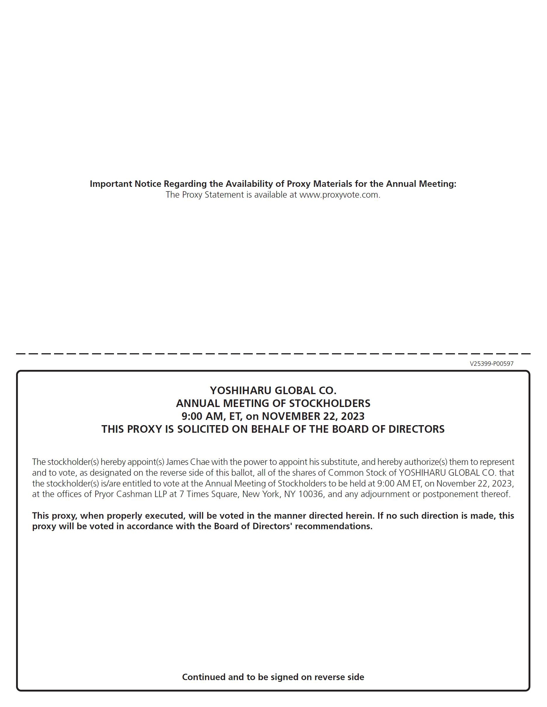 Important Notice Regarding the Internet Availability of Proxy Materials for the Annual Meeting of Stockholders to Be Held on November 22, 2023: The Proxy Statement and the Annual Report to Stockholders are available at https://ir.yoshiharuramen.com/. We encourage you to review all of the important information contained in the proxy materials contained herein or accessed via our website before voting.